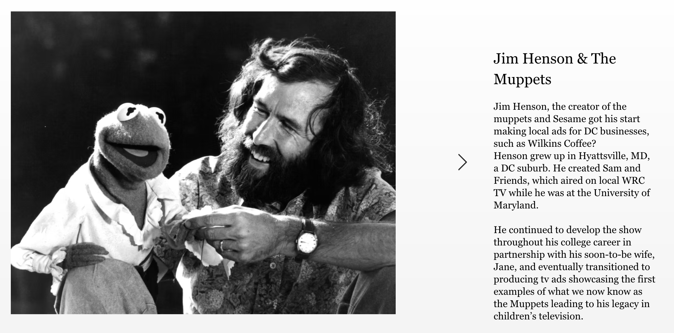 A Kermit-esque puppet sold coffee: While a UMD student majoring in home economics, Henson produced 179 commercials for Wilkins Coffee in Washington, D.C. from 1957-61. They featured cheerful puppet Wilkins, who loved the caffeinated beverages, and grumpy Wontkins, who became so popular that the company offered vinyl versions of the hand puppets through the mail.